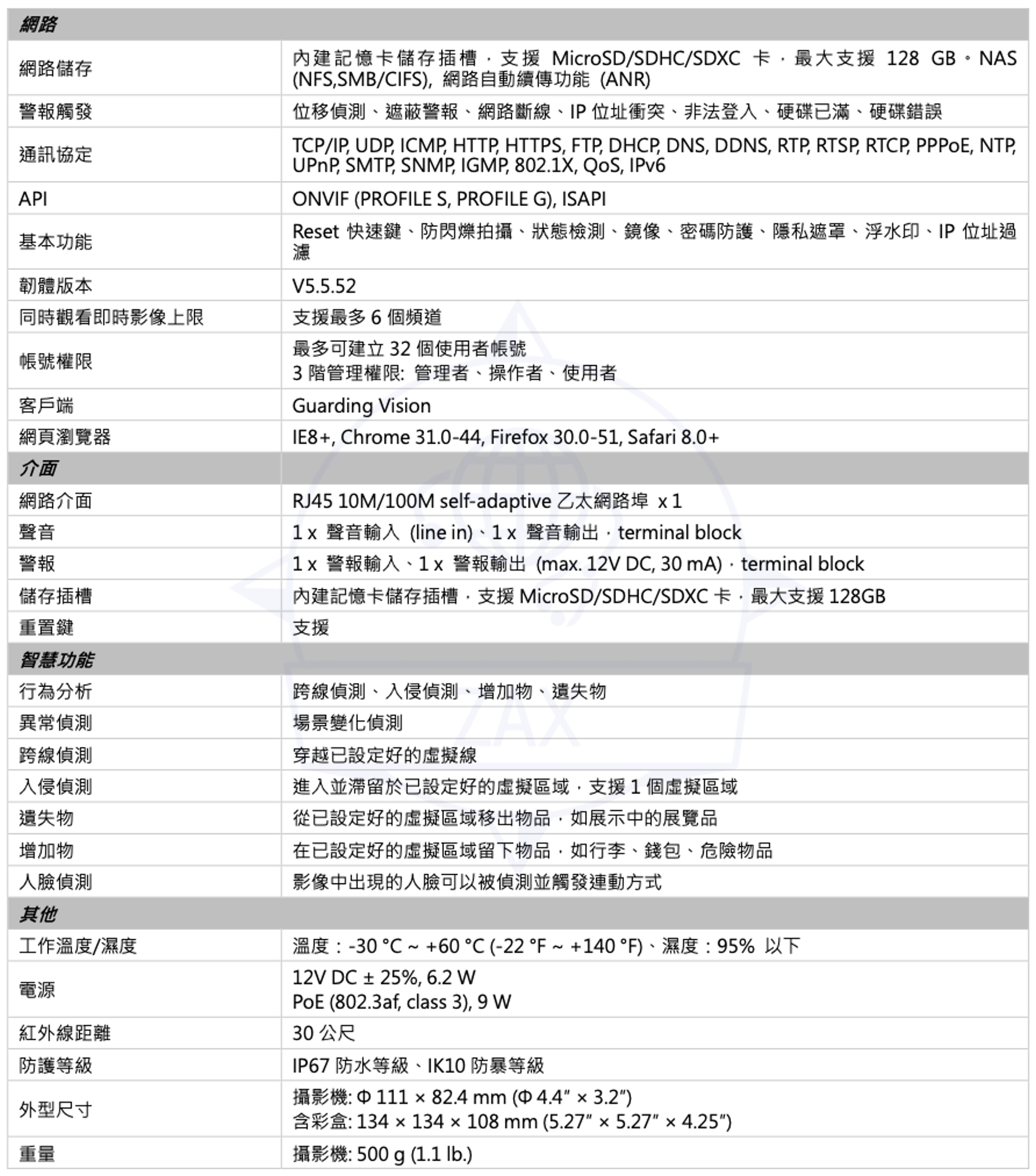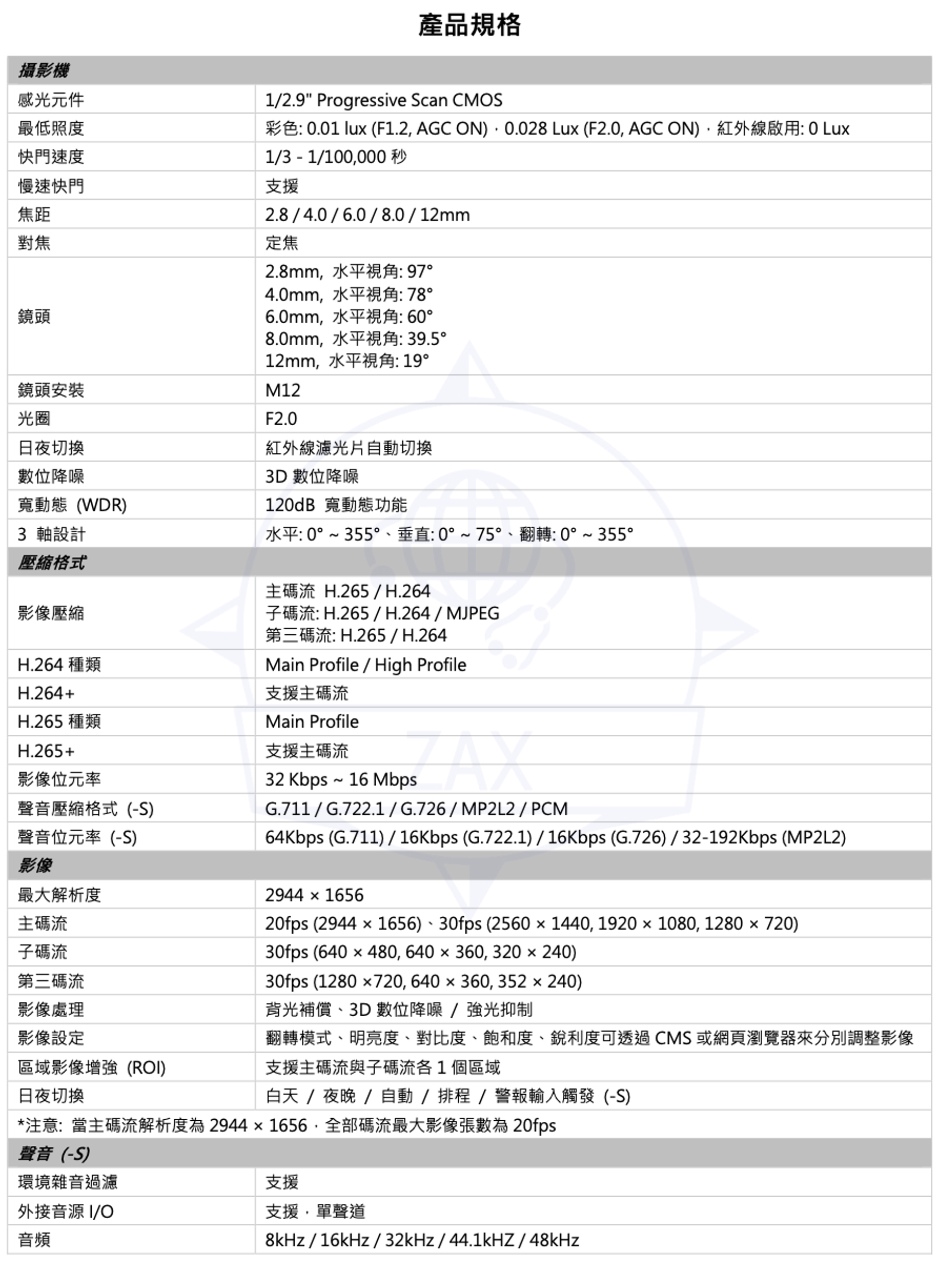 ★ 彩色: 0.01 lux (F1.2, AGC ON),彩色: 0.028 Lux (F2.0, AGC ON),紅外線啟用: 0 Lux